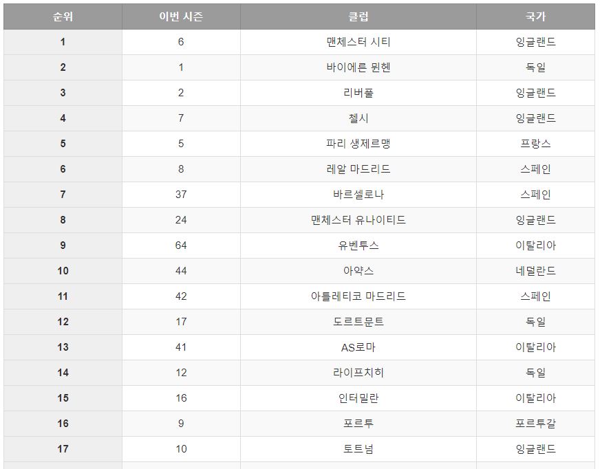 순위 | 이번 시즌 | 클럽 | 국가 | |