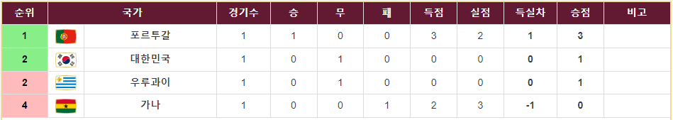 우리나라와 우루과이는 동일하게 4점, 포르투갈이 3점이 되면서 더 알 수 없는 상황이 됩니다.