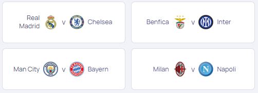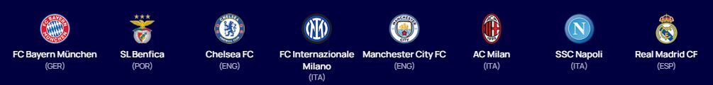 좌측부터 바이에른 뮌헨, 벤피카, 첼시, 인터밀란, 맨체스터시티, AC밀란, 나폴리, 레알마드리드입니다.