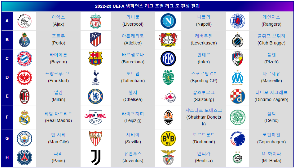 한국시간으로 8월 26일 새벽 1시에 22-23 시즌 UEFA 챔피언스리그 조추첨이 완료되었습니다.