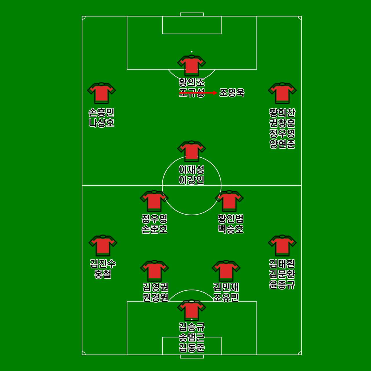 예를 들어, 송흥민 황의조 투톱에 좌우에 황희찬, 권창훈, 나상호, 정우영을 사용하게 됩니다.