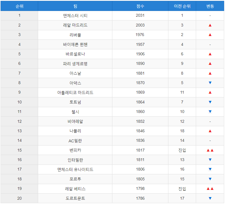 그에 비해서 레알 마드리드는 9점을 추가하여 2000점을 넘기고 2위로 상승하게 되었습니다.