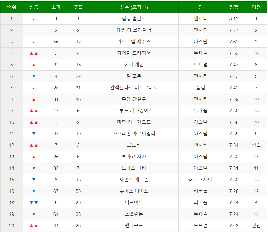로드리, 칼럼 윌슨, 벤 타쿠르가 새롭게 20위권으로 진입하였고,